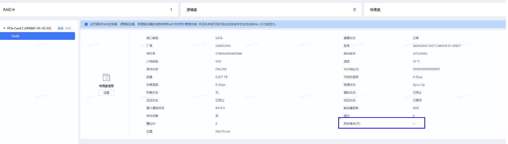 当前 Web 界面显示--说明 BMC 已识别到该硬盘支持预估寿命功能,但尚未获取或计算出有效的生命周期数据。