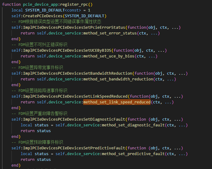 根据提供的代码和上下文信息,pcie_device组件提供了多个与FDM相关的资源协作接口,用于接收和处理PCIe设备的各类故障事件: