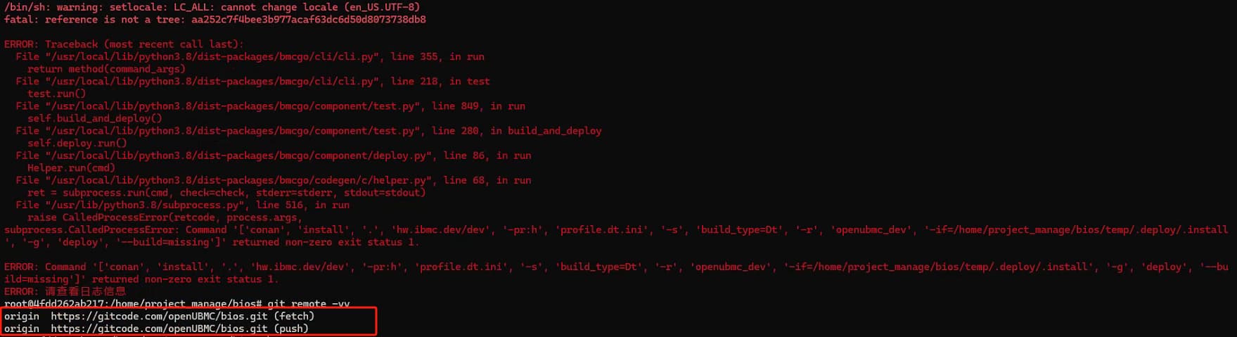 subprocess.CalledProcessError: Command '['conan', 'install', '.', 'hw.ibmc.dev/dev', '-pr:h', 'profile.dt.ini', '-s', 'build_type=Dt', '-r', 'artifactory', '-if=/home/project_manage/bios/temp/.deploy/.install', '-g', 'deploy', '--build=missing']' returned non-zero exit status 1.