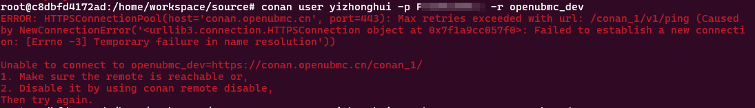 ERROR: HTTPSConnectionPool(host='conan.openubmc.cn', port=443): Max retries exceeded with url: /conan_1/v1/ping (Caused by NewConnectionError('<urllib3.connection.HTTPSConnection object at 0x7faa97ad98e0>: Failed to establish a new connection: [Errno -3] Temporary failure in name resolution'))