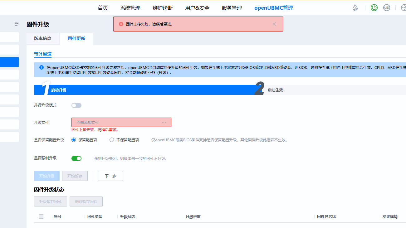 - 现象:上传固件包时报错“固件上传失败,请稍后重试”。