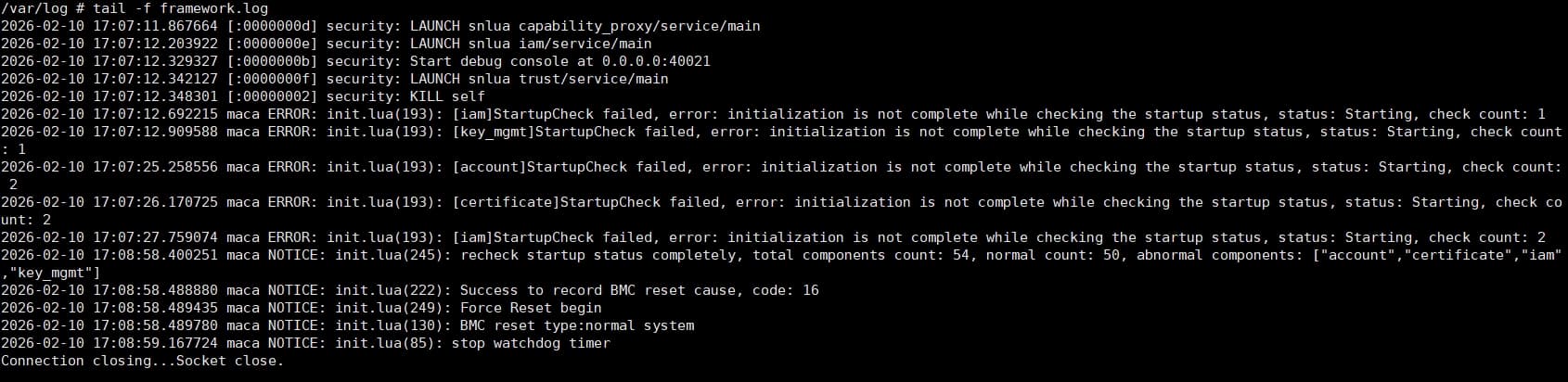 BMC系统中的 maca(Management Component Assurance Agent)会监控各核心服务的启动状态。certificate 服务未就绪会导致整个系统判定为“未完成初始化”,从而触发自动强制重启。