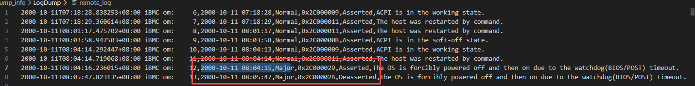 722:The OS is forcibly powered off and then on due to the watchdog(BIOS/POST)…(严重级别)723:该事件的解除(Deasserted)ipmi_core ERROR: watchdog.lua(145): [system_id:1] ipmi watchdog2 timeout power cycle success