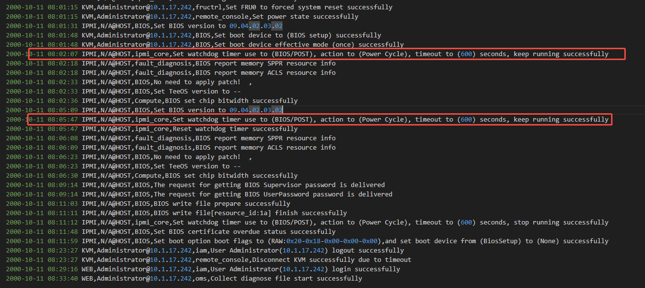 | 核心实体 | bmc.kepler.Watchdog2.Status, BIOSPOSTExpirationFlag, ipmi_core.Set watchdog timer use to (BIOS/POST) |