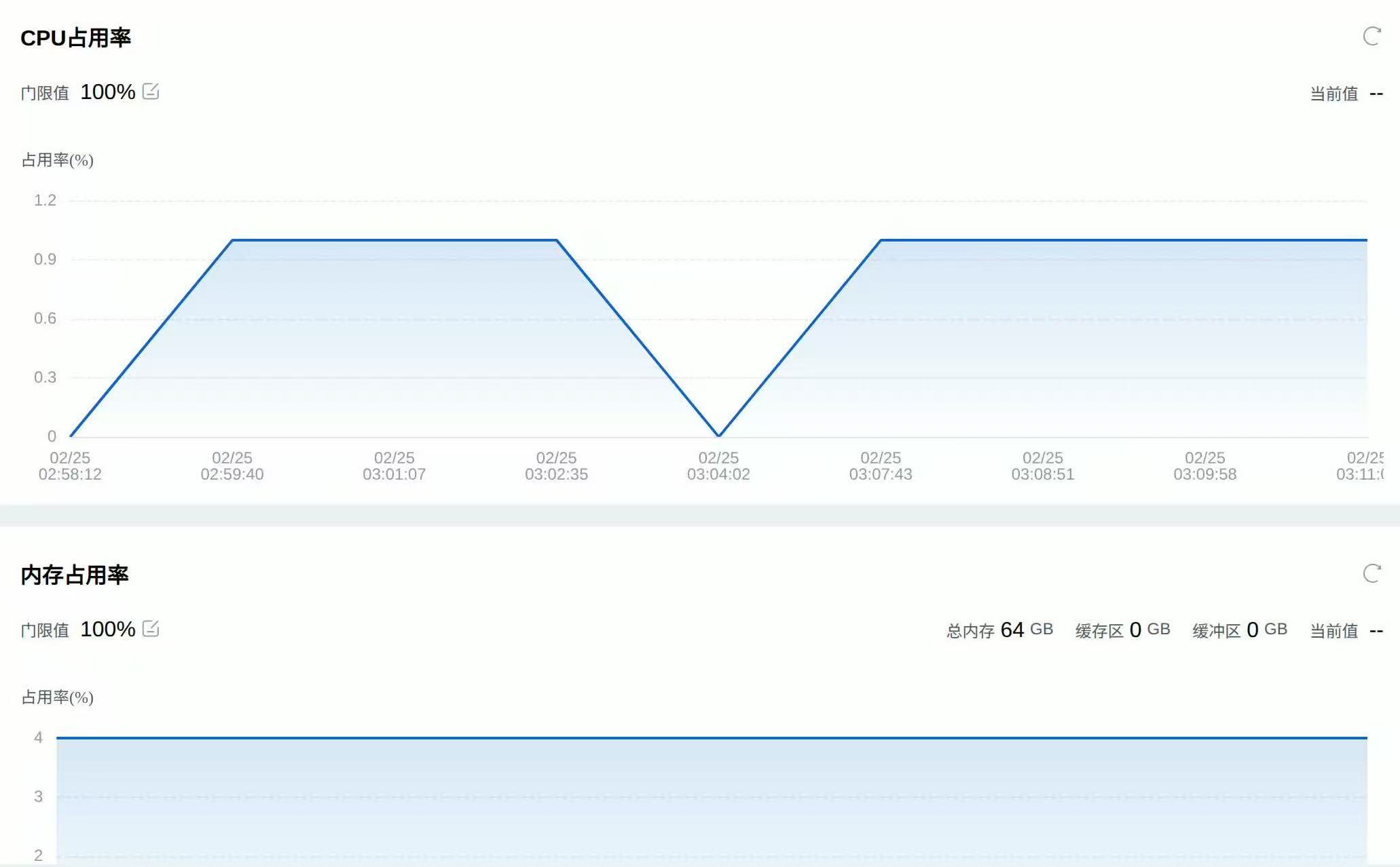 查看 总内存使用率、总CPU使用率 是否有数据 |