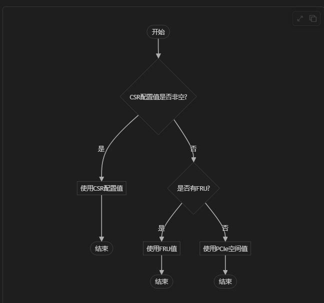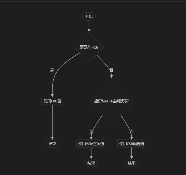 方案2:先判断csr配置的值,如果非空则用csr配置的值,不再考虑fru和PCIe空间;如果为空则再看有没有fru,如果有fru,则用fru中读取的值,如果没有fru则继续读取PCIe空间的值;