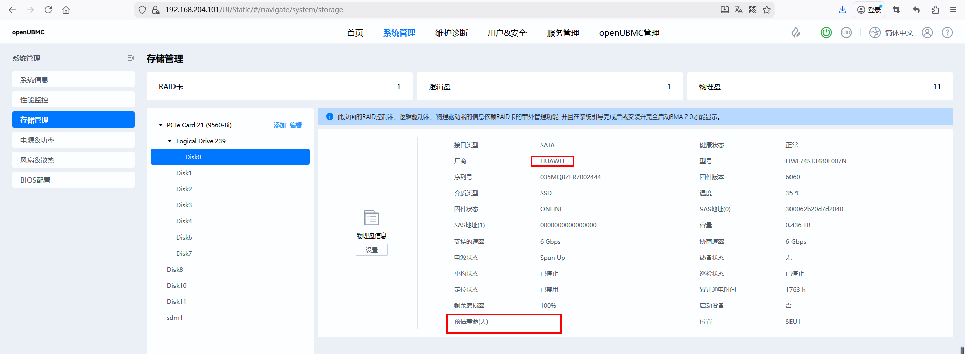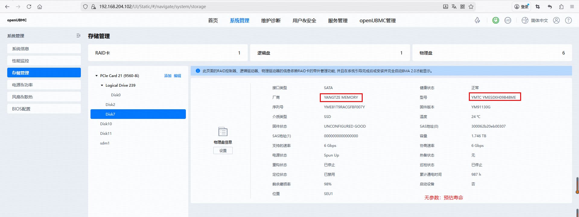 在 openUBMC 系统的 存储管理 页面中,厂商为 YANGTZE MEMORY(长江存储) 的 SSD 硬盘 未显示“预估寿命”参数,而其他厂商(如华为)的硬盘则可以正常显示该参数(即使值为 --)。这一现象表明系统对长江存储硬盘的健康状态信息采集存在兼容性或数据映射问题。