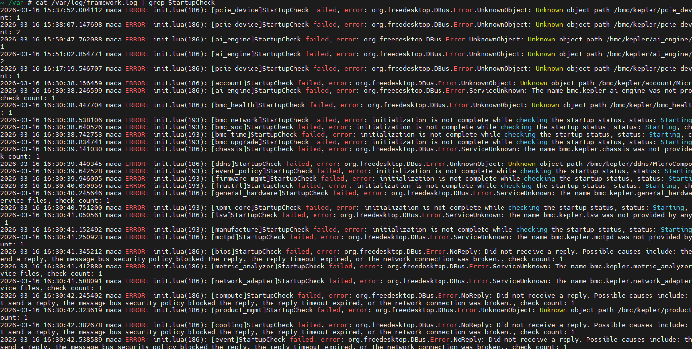 2.尝试使用telnet连接BMC,查看framework.log发现出现大量组件启动检查失败