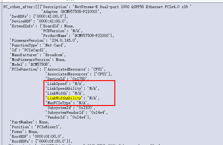 根据您提供的问题描述和上下文信息,部分 PCIe 网络适配器(如 Broadcom BCM957508-P2100G)在特定条件下出现 LinkWidth、LinkSpeed、LinkSpeedCapability、LinkWidthCapability、MaxPCIeType 等关键属性值为 "N/A" 的现象。该问题可能影响系统对硬件链路状态的监控、带宽告警判断及拓扑管理。