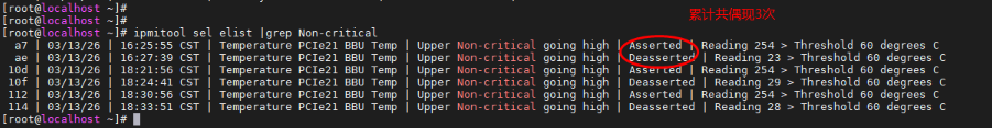 AC测试偶现9560-16i Raid卡偶现高温告警,出现高温告警时,BBU温度传感器读值都是254。