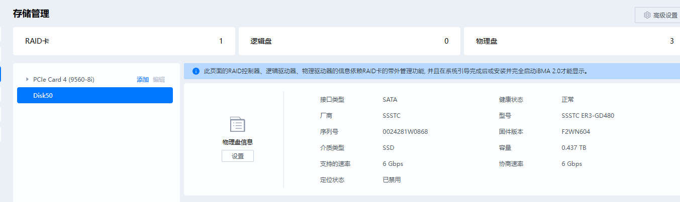 - 系统具备带外管理能力,依赖BMA 2.0展示RAID和硬盘信息