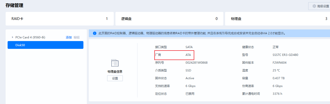 - 若RAID卡驱动未向BMA提供正确Vendor Name,或BMA未翻译Vendor ID,则显示降级为“ATA”。