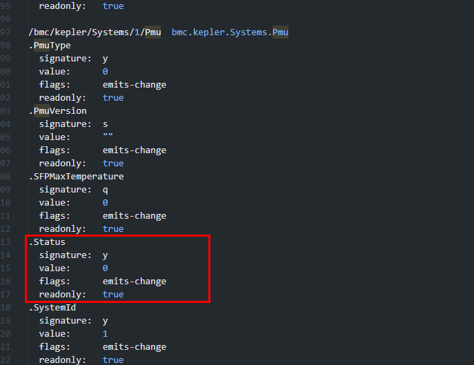 busctl get-property bmc.kepler.Systems.Pmu /bmc/kepler/Systems/1/Pmu bmc.kepler.Systems.Pmu Status