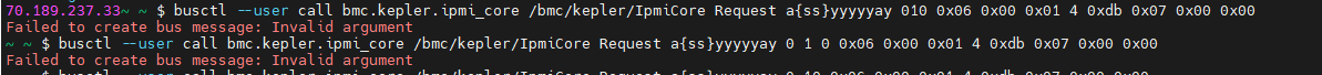 busctl --user call bmc.kepler.ipmi_core /bmc/kepler/IpmiCore Request a{ss}yyyyyay 010 0x06 0x00 0x01 4 0xdb 0x07 0x00 0x00
