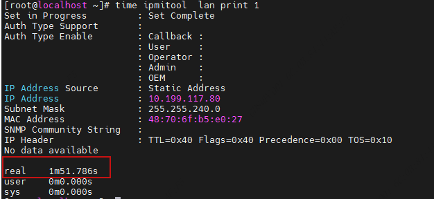 DC测试完后,发现执行带内执行ipmitool lan print 1命令卡顿;