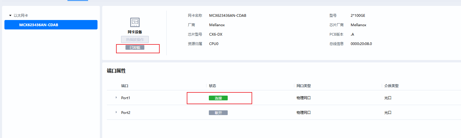 目前项目在适配MCX623436AN-CDAB网卡,网卡正常插入并连接一根网线,但是网卡页面显示处于已卸载状态