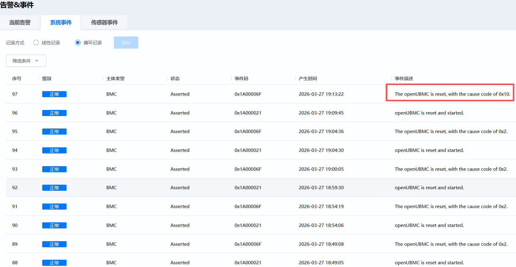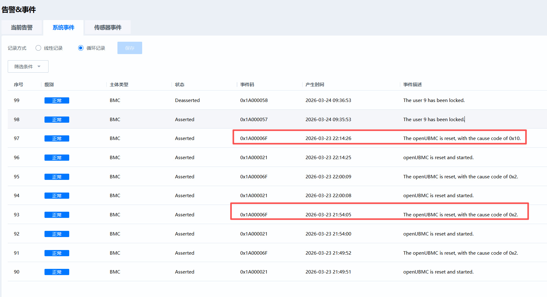 "The openUBMC is reset, with the cause code of 0x2.""The openUBMC is reset, with the cause code of 0x10."这两条记录均由同一事件模板生成,只是运行时的 Cause Code 不同。