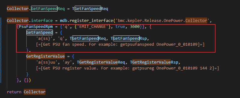 接口bmc.kepler.Release.OnePower.Collector下面注册了一个属性PsuFanSpeedRpm,两个method分别是GetFanSpeed和GetRegisterValue,现在怎么吧GetFanSpeed方法的返回值赋值给属性PsuFanSpeedRpm,库上没有样例可参考,麻烦专家帮忙看看。