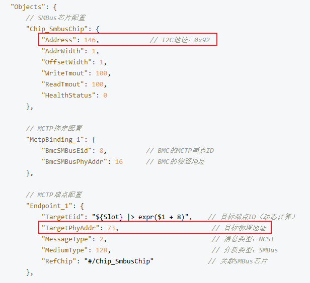 MctpBinding_1 配置链接 BMC 的 SMBus 物理地址与 Chip_SmbusChip,用于通信路由。