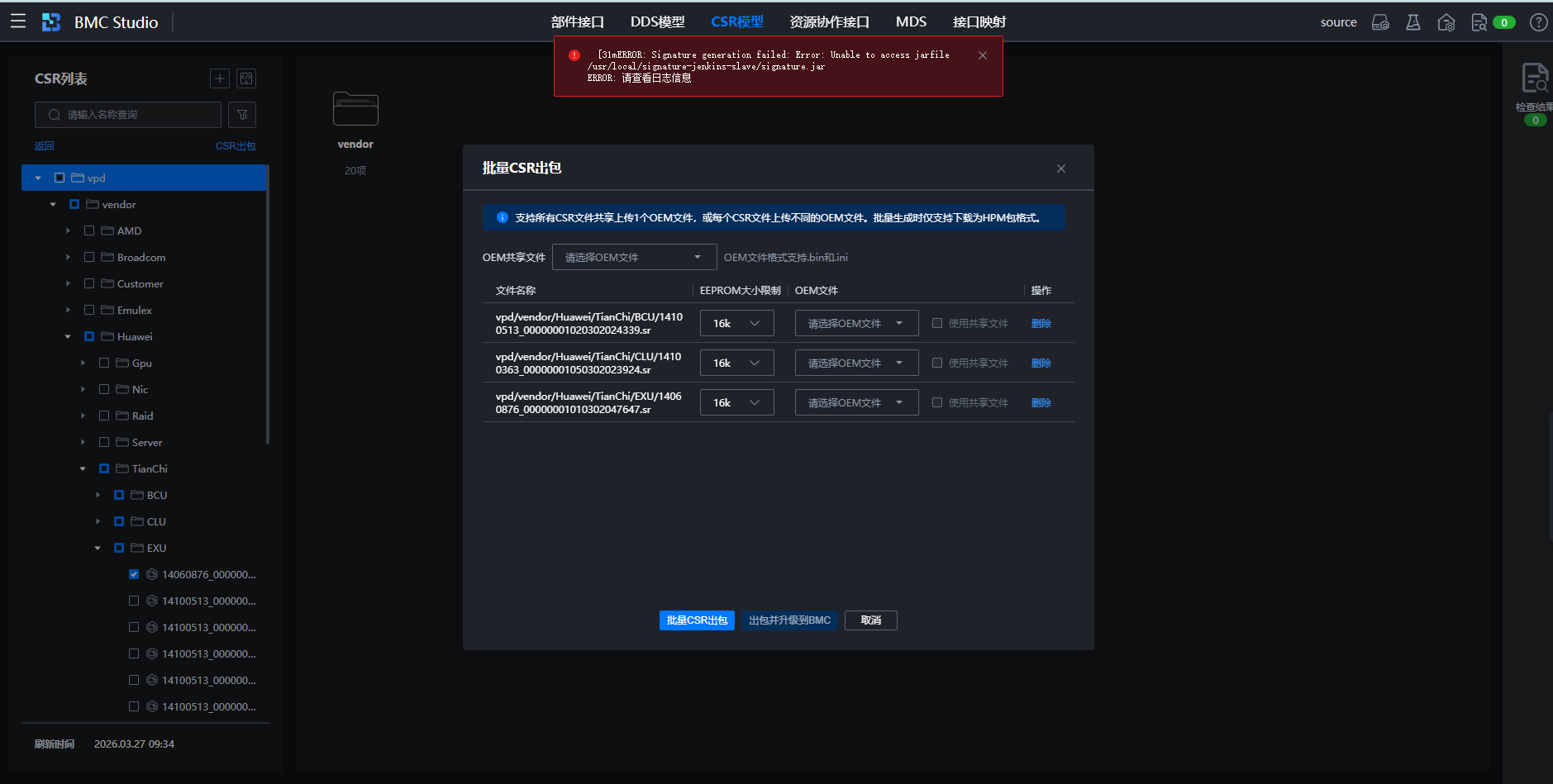 我们现在需要用bmcstudio出csr包,在高可用版本上进行CSR升级,之前的bingo studio出的csr包没有签名,升级失败了。后面用bmcgo studio出csr包,结果出现这个错误,请问这个问题需要如何解决?