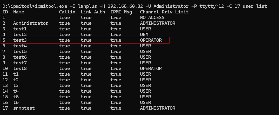 ipmitool user list命令显示其权限为"OPERATOR"