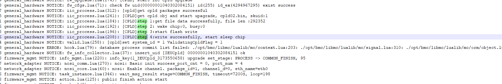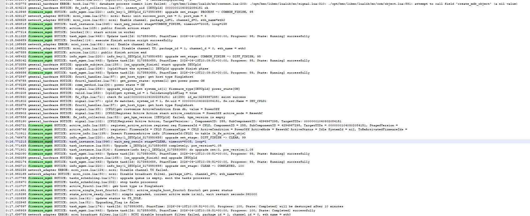 firmware_mgmt NOTICE: info_mgmt.lua(220): info_key(1_IEUCpld_3173550658) upgrade set_stage: PROCESS → COMMON_FINISH, 95