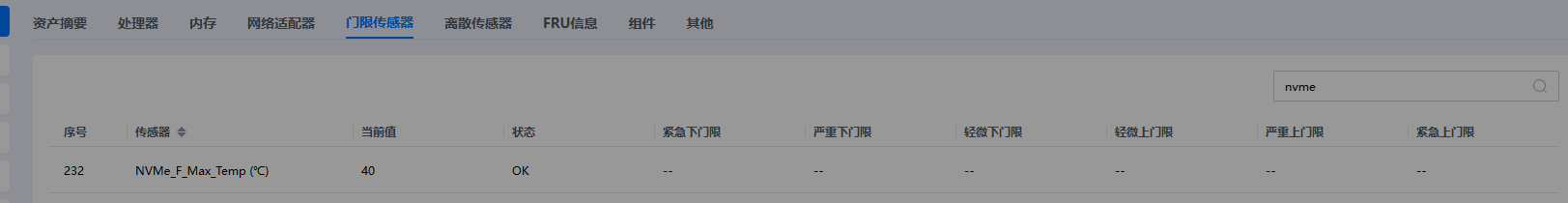ThresholdSensor的显示受Status和ReadingStatus控制,若为Disabled或非零码,将不显示。