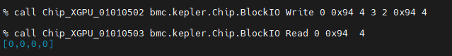 mdbctl call <ChipObjectName> bmc.kepler.Chip.BlockIO Write <Offset> <Data...>