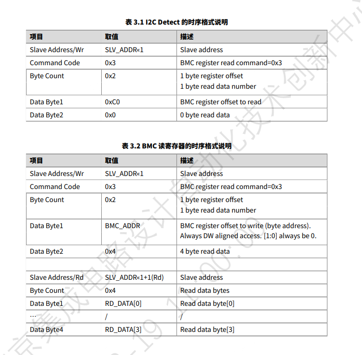 根据 表 3.1 I2C Detect 的时序格式说明 和 表 3.2 BMC 读寄存器的时序格式说明,您当前执行的三步操作如下:
