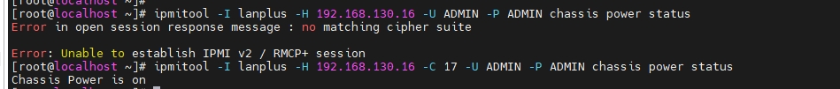 -C 17 才可建立会话ipmitool -I lanplus -H 192.168.130.16 -U ADMIN -P ADMIN -C 17 chassis power status
