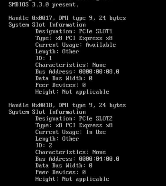 使用dmidecode --type 9 查询BMC上报,可以看到Bus Address为 4:00.0 的Pcie Slot2正在使用中