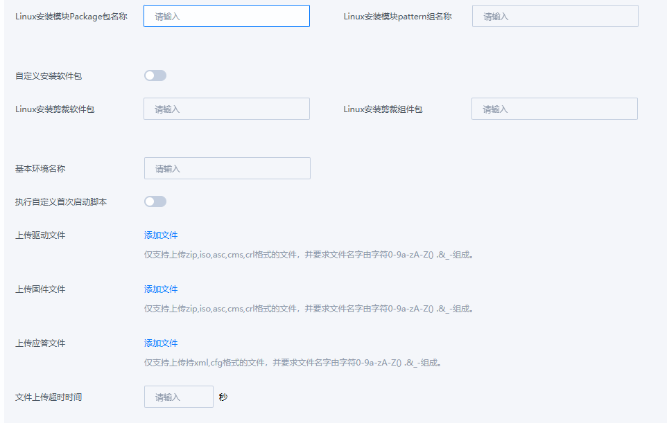 - 上传驱动文件、固件文件、应答文件:支持上传zip、iso、asc、cms、crl格式的文件,这一限制也适用于应答文件(xml、cfg格式)。文件命名要求使用字符0-9a-zA-Z0_&_-组成。