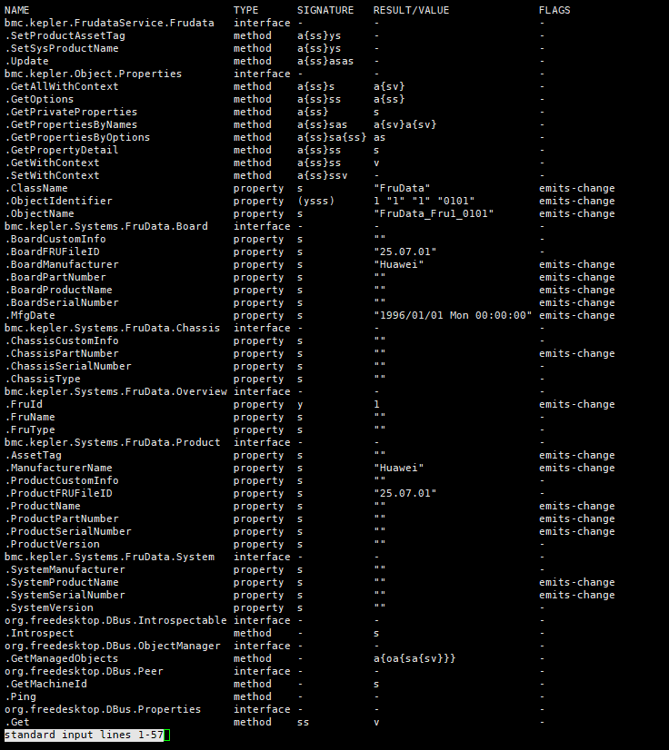busctl --user introspect bmc.kepler.frudata /bmc/kepler/Systems/1/FruDatas/FruData_Fru1_0101