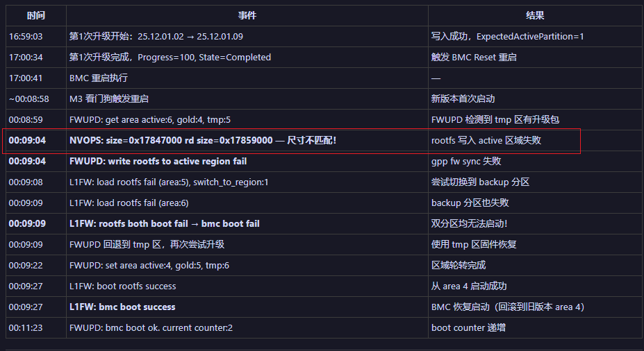 BMC升级后回滚的根本原因是 M3 固件层在将 tmp 区 rootfs 同步到 active/gold 区时,检测到 rootfs 镜像尺寸不匹配(size=0x17847000 vs rd size=0x17859000),导致 rootfs 校验失败(ret:-22),active 区域 rootfs 未被正确更新。重启后双分区均无法加载 rootfs,触发回滚机制,系统从旧的可用固件恢复启动。