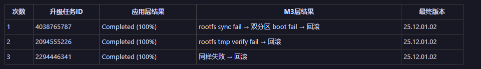 每次应用层都报告"升级成功",但 M3 底层始终因为 rootfs 镜像尺寸校验失败而无法完成固件同步。