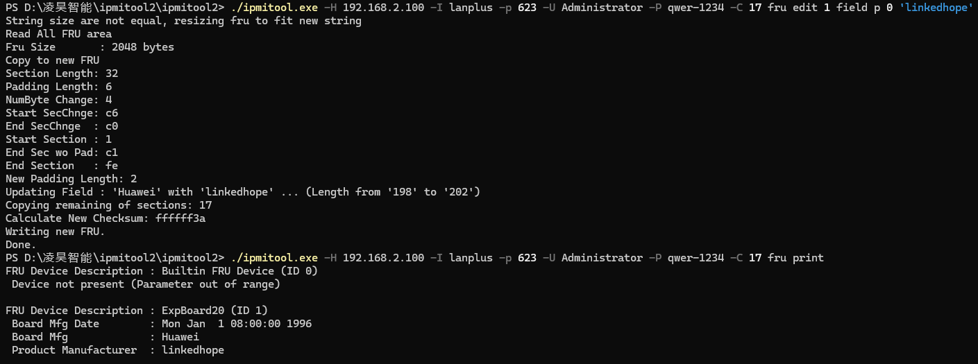 fru edit must modify fields with existing content, otherwise error occurs.- 您的操作日志显示:“Read All FRU area”、“Copying remaining of sections”,表明是在已有结构上修改字符串。