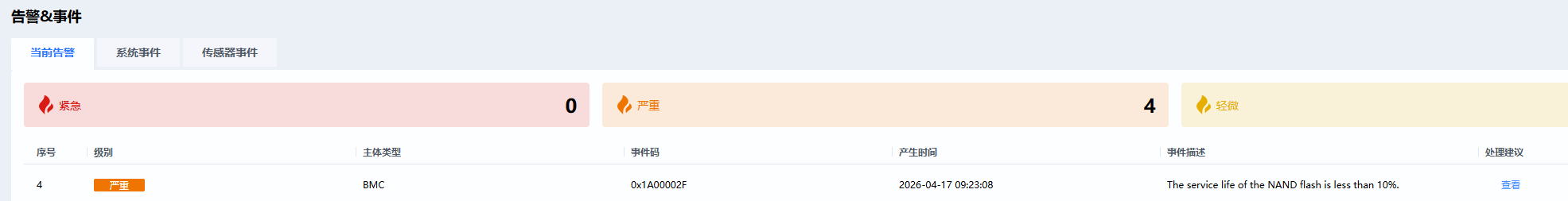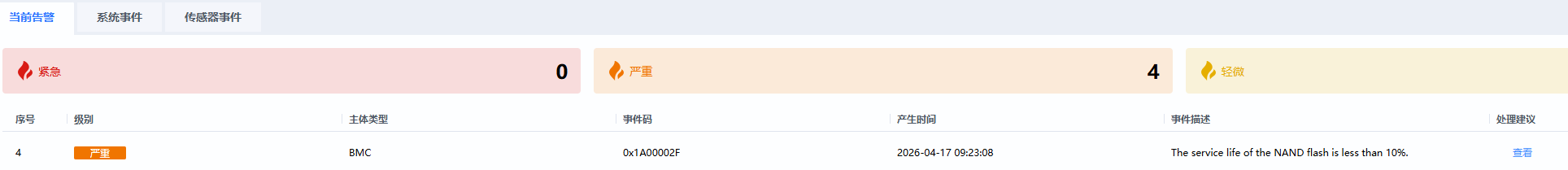 0x1A00002FThe service life of the NAND flash is less than 10%.LifeTime=4,表明系统报告 NAND 闪存寿命低于 10%,触发告警。然而,在回退到未升级的 BMC 固件版本后,该告警消失,且 LifeTime 恢复为 89,说明此为 误报或兼容性问题。