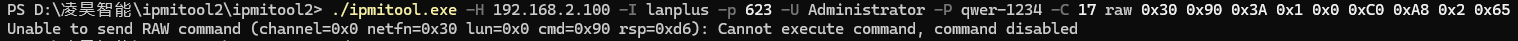 错误码 rsp=0xd6 含义为 “Cannot execute command, command disabled”,即该 IPMI 命令当前在 BMC 固件中被禁用。