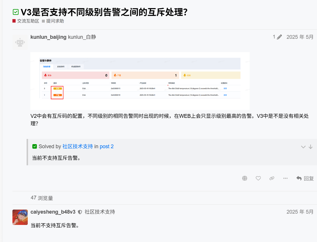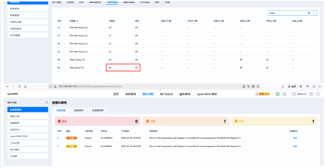 模拟进风口温度为42度时,同时上报轻微和严重2条告警。之前看社区上提过没有互斥码,目前不支持互斥。但后面sp1版本测,之前社区上提那个硬盘温度不互斥看起来没有了,是否进风口温度也能修改实现。
