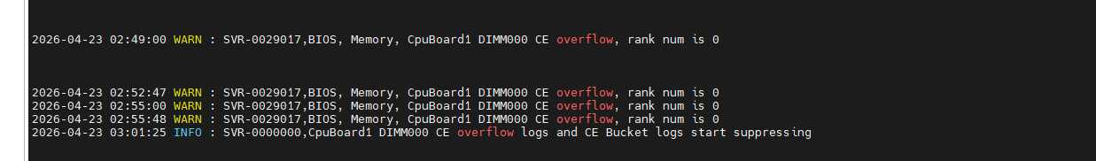 CorrectableECCOverflow:表示具体内存已经发生CE错误超阈值事件,阈值和计数都在BIOS选项配置和统计;