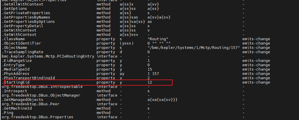 busctl --user get-property bmc.kepler.mctpd /bmc/kepler/Systems/1/Mctp/Routing/157 bmc.kepler.Systems.Mctp.PCIeRoutingEntry StartingId