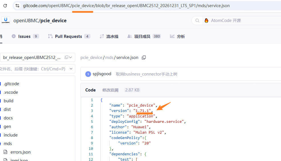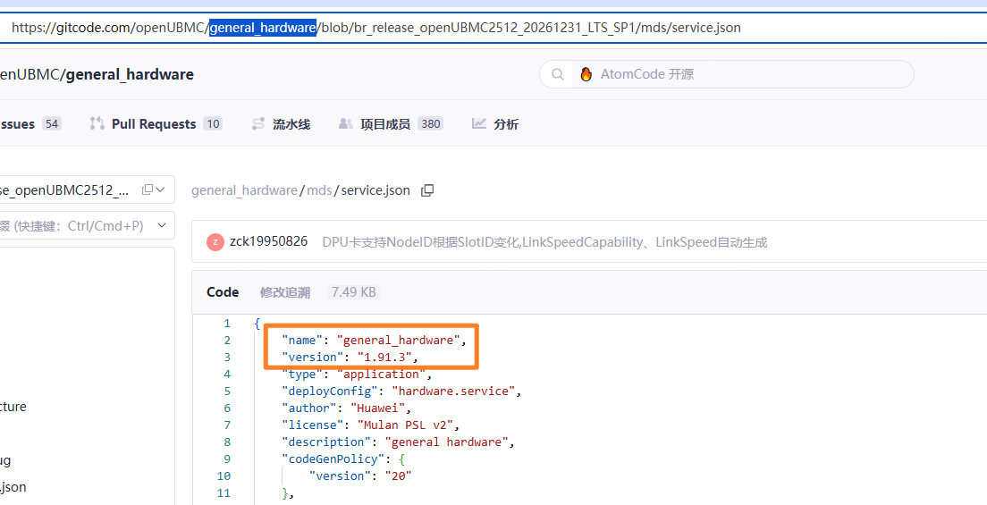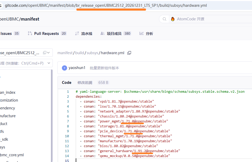 根据您提供的图片和代码对比信息,openUBMC 25.12 SP1(分支:br_release_openUBMC2512_20261231_LTS_SP1)的 manifest 仓库中,确实存在 组件在 manifest.yml 中声明的版本号低于其实际代码仓库中 service.json 定义的版本号 的现象。