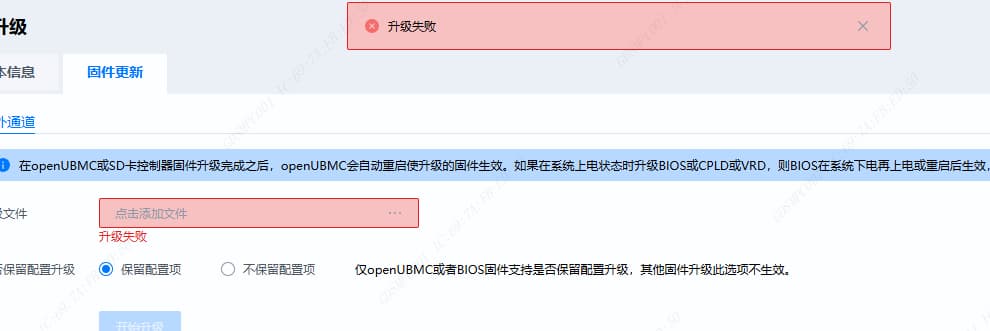 2025-05-12 09:26:30.481435 firmware_mgmt ERROR: control.lua(321): parse package(rootfs_openUBMC.hpm) failed, ret:FirmwareUpgradeError: An error occurred during the firmware upgrade process. Details: Upgrade write config file failed.