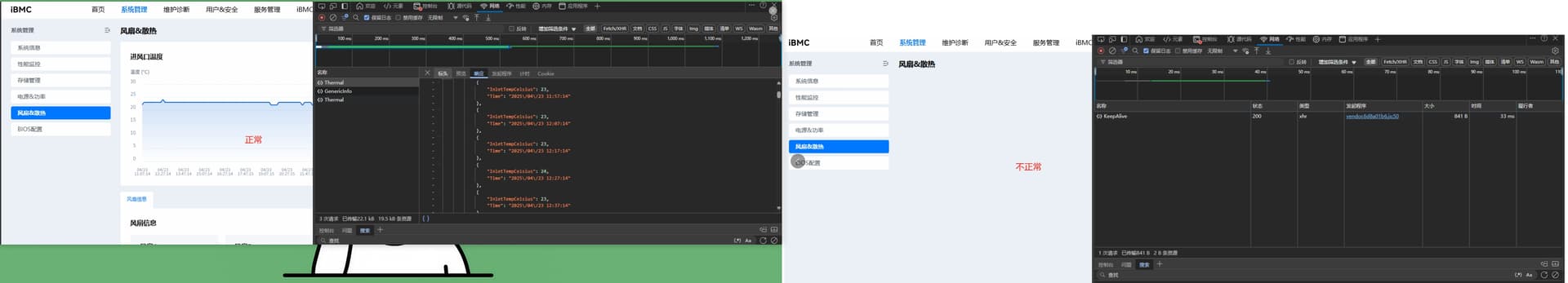 1、问题背景:前端点击"系统管理"->“风扇&散热”选项,第一次点击“风扇&散热”能够正常获取风扇信息,如果不去点击其他选项的情况,重复点击“风扇&散热”选项会获取不到风扇信息。