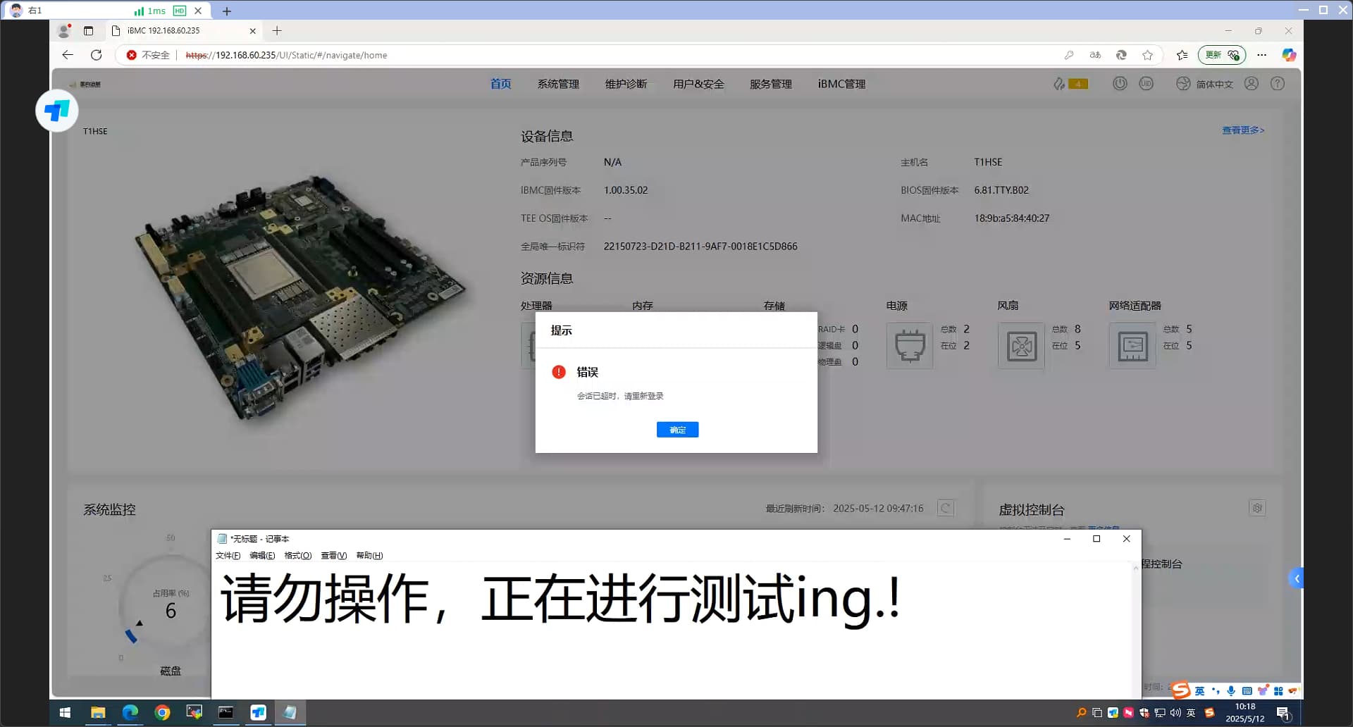 求组: 1.Web服务设置480超时时间,BMC没有到达规定时间提示“BMC提示会活已超时重新登录”。