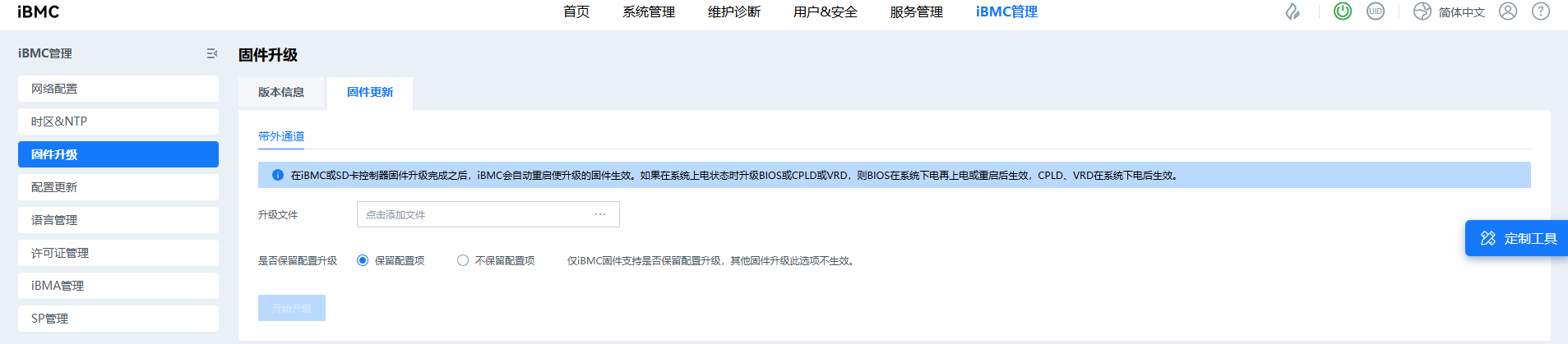 web升级界面下面的保留配置选项是说是否要保留BMC的配置,如果选择“不保留配置”,则升级完BMC只会会进行恢复出厂设置;