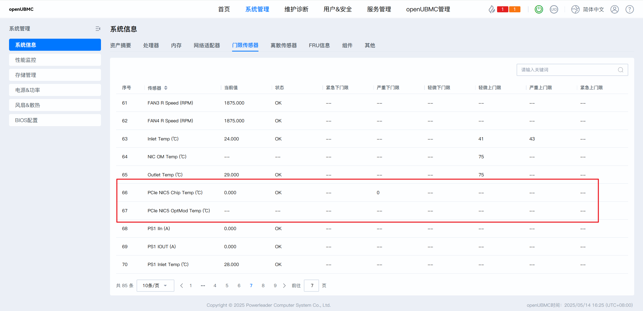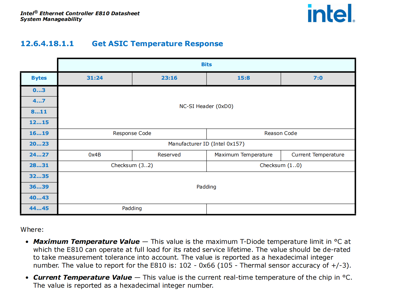 由于 E810 网卡的带外信息获取通过标准的 NISC 协议获取,当前network_adapter 组件的 hardware_config 目录下 BoradCom.lua 中使用的是标准 NCSI 协议获取,我们尝试新增的 E810.lua 文件直接继承 BoradCom.lua,并在此基础上新增了 Intel E810 的 NCSI OEM 命令去获取芯片温度和光模块温度,现在代码编译出的包在机器上现象如下: