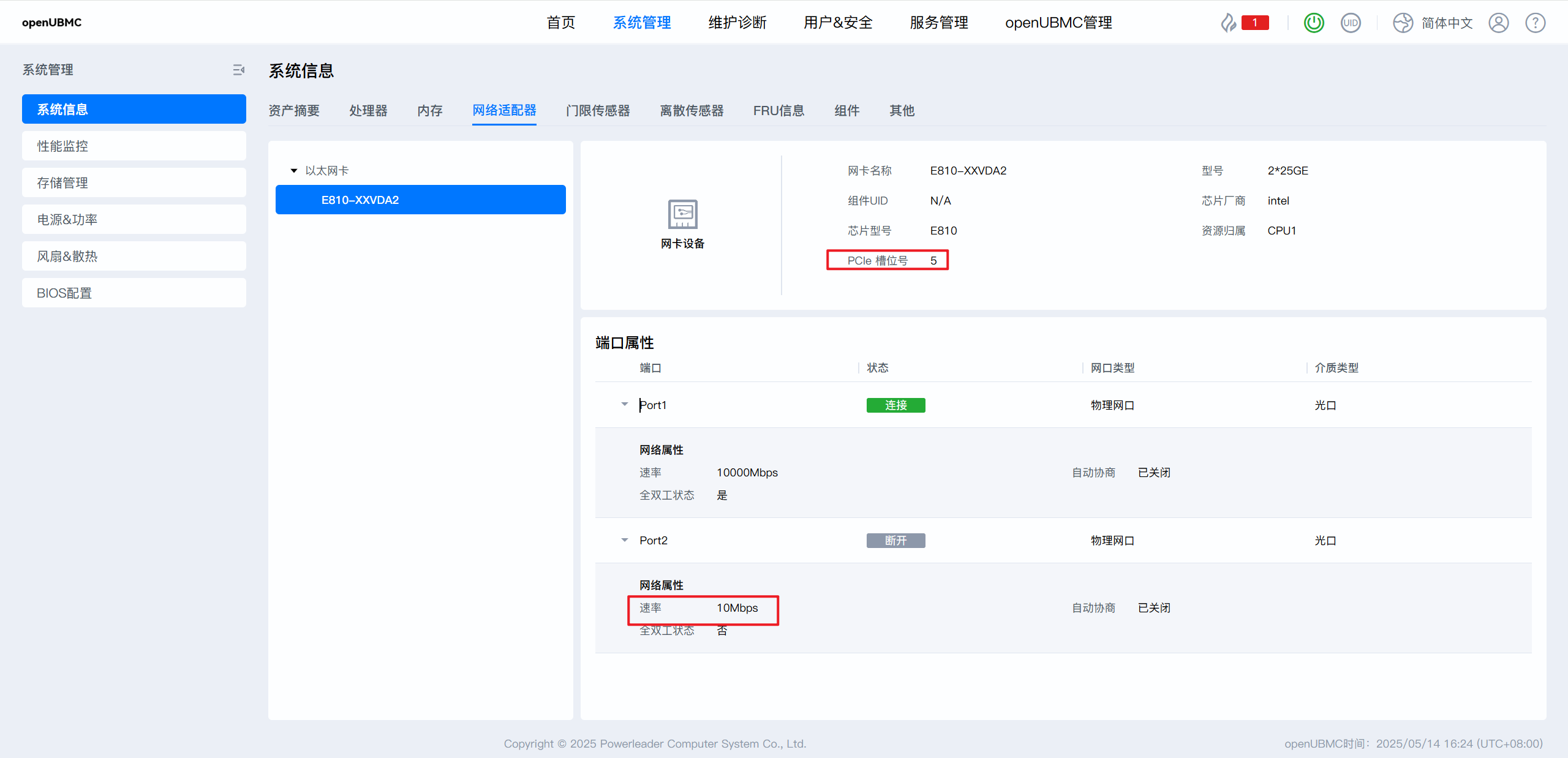 - 网卡的网络属性速率能够获取,但断开的网口速率显示为 10Mbps;